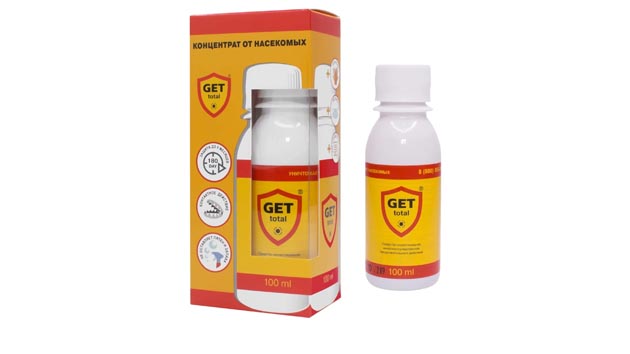 Get Total – концентрат для приготовления раствора, основным действующим веществом которого является хлорпирифос 5%. Этот препарат эффективен для уничтожения постельных клопов, домашних муравьев, блох и мух. После распыления средство высыхает в течение восьми часов, оставляя на поверхности микрокапсулы, сохраняющие свою токсичность в течение полугода. Большинство постельных клопов погибают в течение первых двух часов после применения этого средства, оно также уничтожает яйца насекомых.